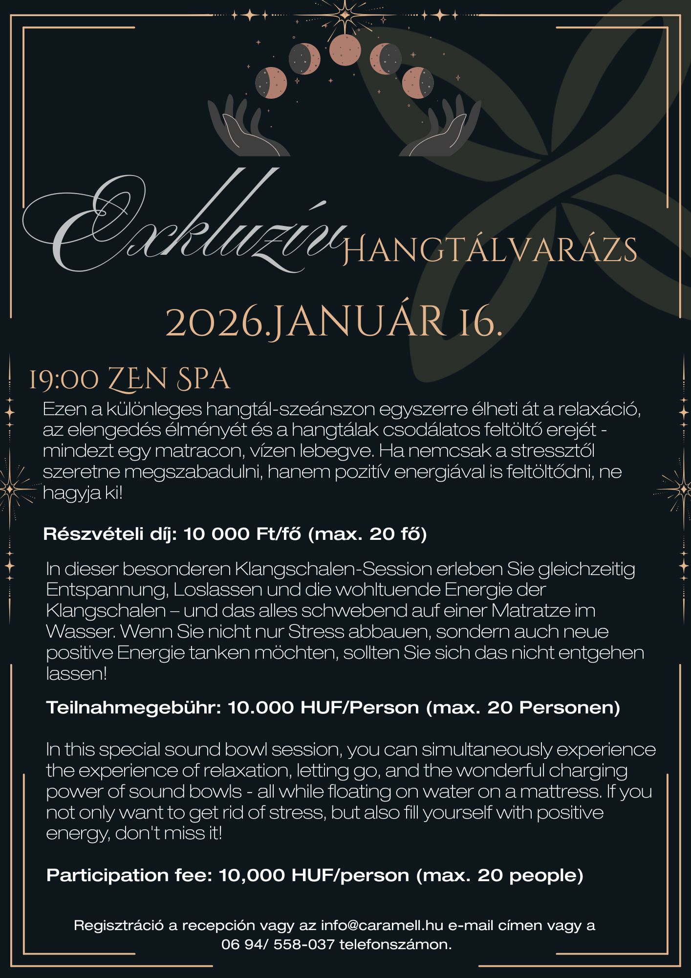 Regisztráció a recepción vagy az info@caramell.hu e-mail címen vagy a
