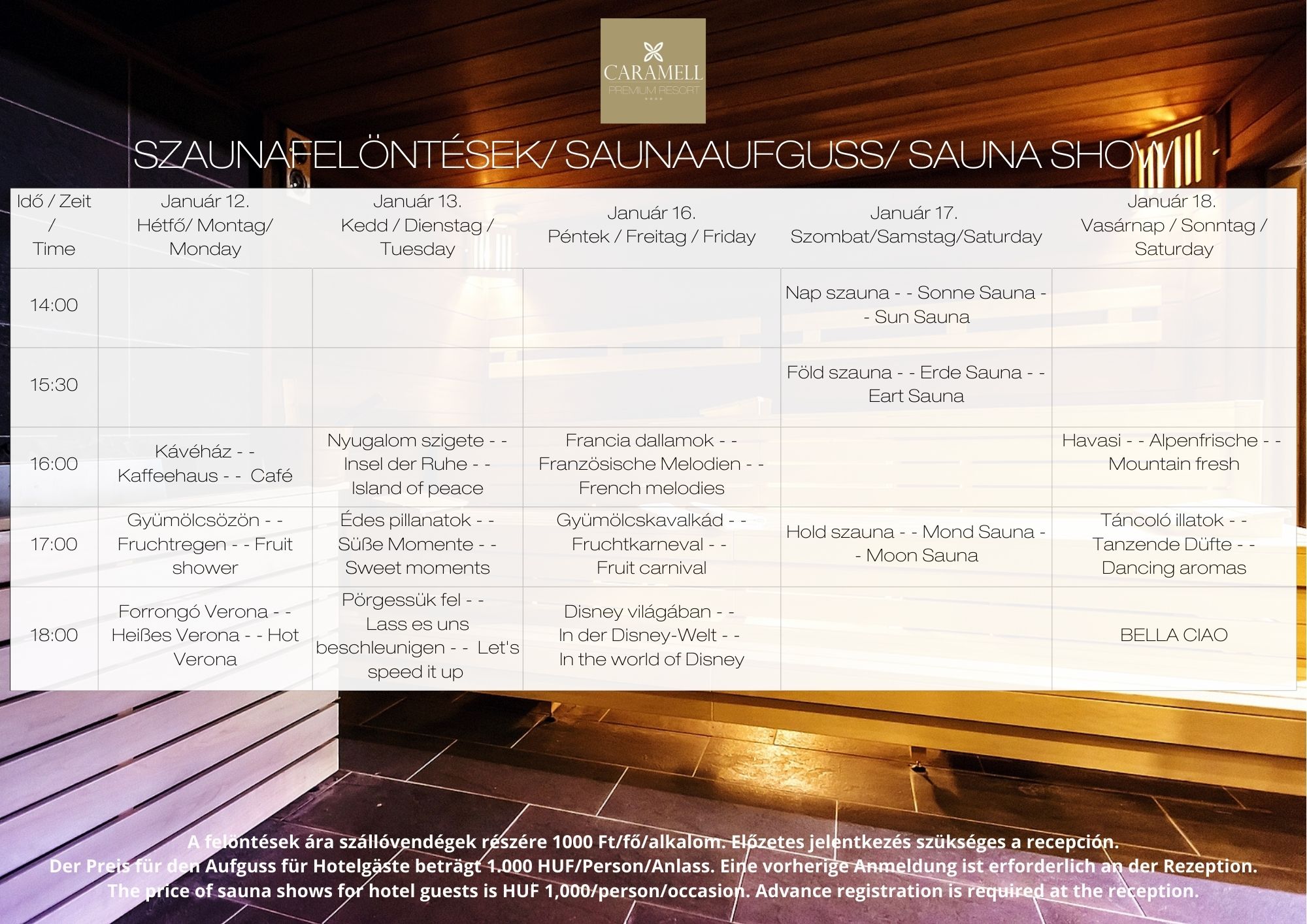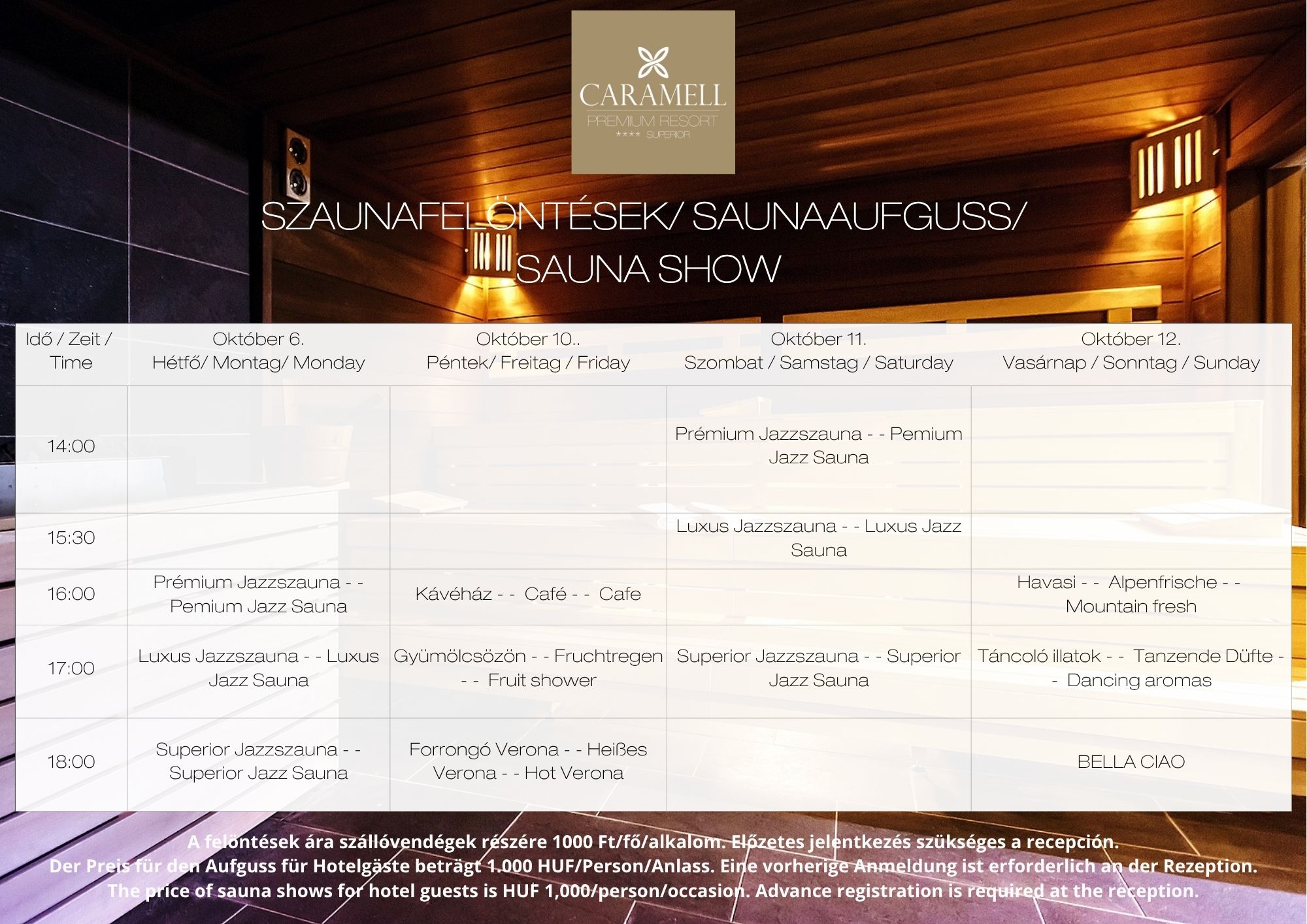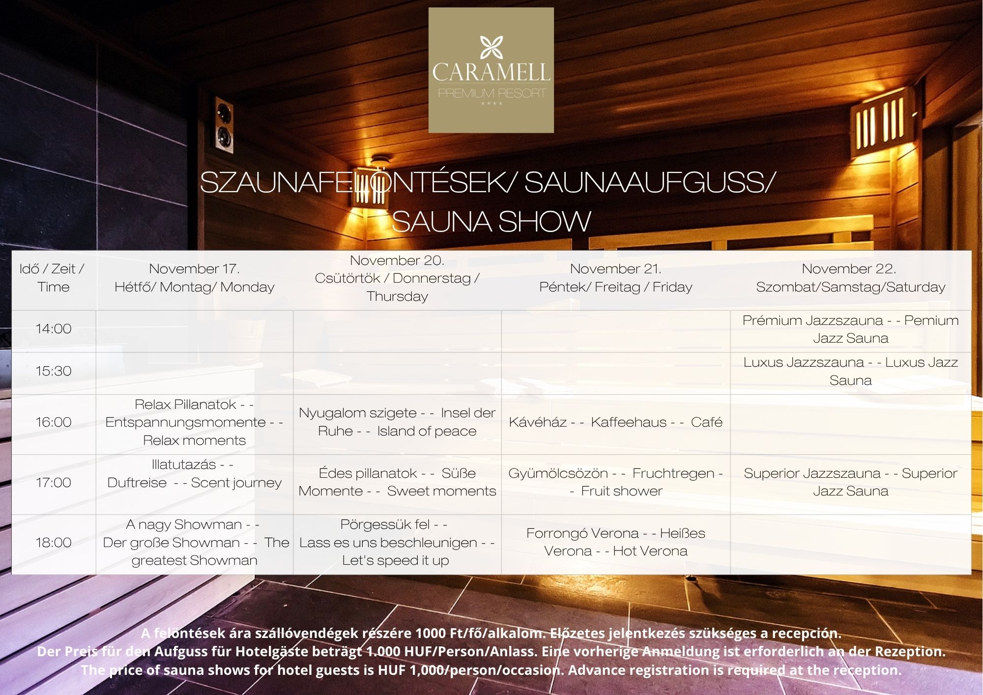 Die Gebühr für Saunaaufgüsse beträgt 1000 HUF pro Person und Aufguss.